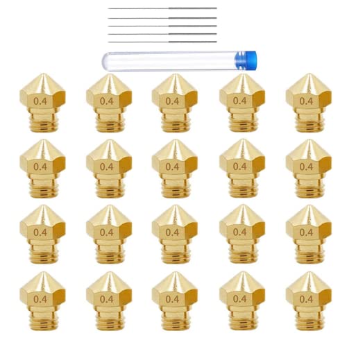 | Features | Material: made of high quality brass, sturdy and durable, Installation: external M7 thread connection, Size: input diameter is 1.75mm, output diameter is 0.4mm, Compatibility: flashforge and others using the MK10 nozzle, Package Include: 20 x 0.4mm MK10 extruder nozzles, 5 x 0.4mm Cleaning Needles |