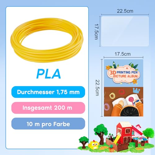 AFXXE 3D Stift filament PLA, 20 Farben, je 10m- 3D Pen Filament 1.75mm mit Vorlagen Set für Kinder & Erwachsene, 3D Stift Zubehör Filament mit Schablonen für ODRVM, Tecboss, Lovebay, 3D Drucker Stift