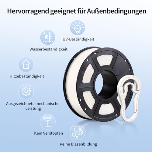 Die Verwendung dieses Filaments garantiert, dass deine Drucke auch nach längerer Exposition gegenüber den Elementen ihre Form und Farbe behalten. Daher ist es eine ausgezeichnete Wahl für alle Benutzer, die lange haltbare und zuverlässige Außenanwendungen benötigen.