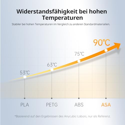 Ein weiteres herausragendes Merkmal des ASA Filaments ist seine hohe Temperaturbeständigkeit. Mit einer Wärmverformungstemperatur von bis zu 90 °C kann es extremen Bedingungen standhalten, die die Leistung anderer Materialien wie ABS oder PETG schnell beeinträchtigen.