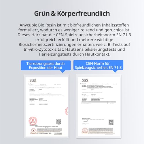 Die Sicherheit ist beim Umgang mit 3D-Druckharzen von großer Bedeutung. Das ANYCUBIC Bio Resin hat bedeutende Sicherheitsstandards erreicht, was es zu einer ausgezeichneten Wahl für Einsteiger macht. Die Zertifikate bestätigen, dass das Harz sowohl für die Umwelt als auch für die Haut unbedenklich ist.