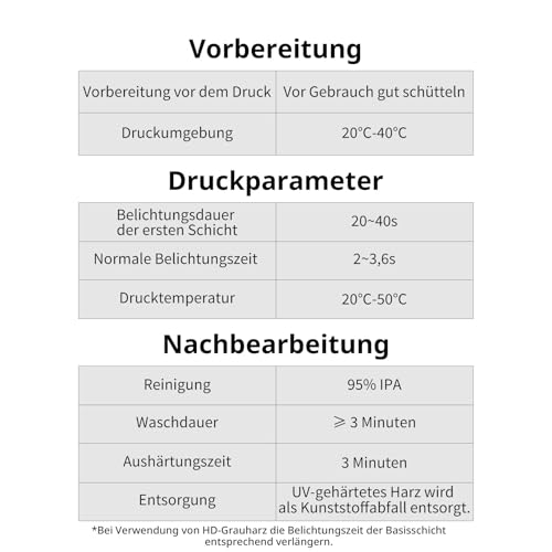 Dank der speziellen Formulierung des Harzes wird zudem sichergestellt, dass die Stabilität und die mechanischen Eigenschaften der Drucke nicht beeinträchtigt werden, während die Aushärtung erfolgt. Dies macht das Produkt zur ausgezeichneten Wahl für detaillierte und komplexe Drucke.