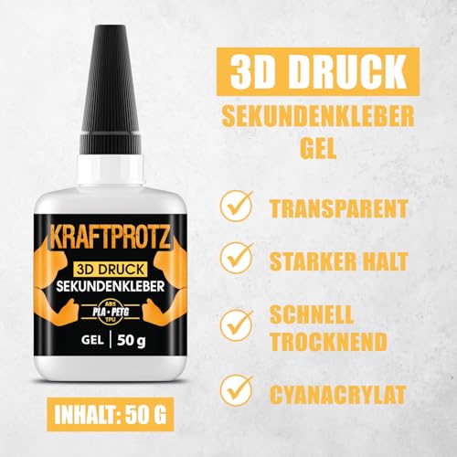 50 g 3D DRUCK Sekundenkleber extra stark – Inkl. Anti-Austrocknung-Spitze – KRAFTPROTZ – Dickflüssiger Superkleber – Wasserfest – PLA-Kleber, ABS-Kleber, PETG-Kleber & TPU-Kleber