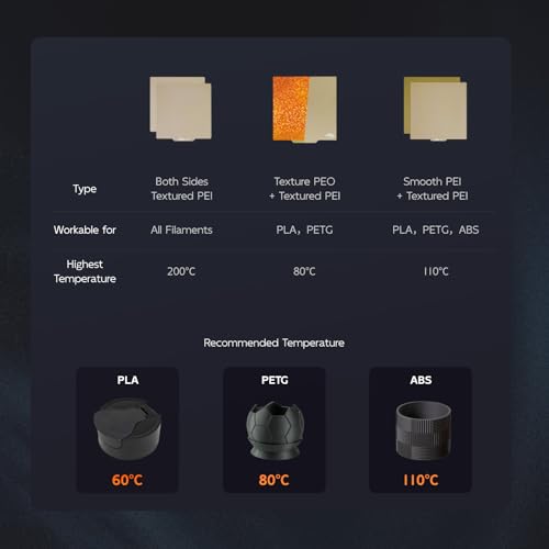 | Features | Beidseitig strukturierte PEI Bauplatte für Adventurer 5M/Adventurer 5M Pro 3D-Drucker, 235x235mm Hochtemperaturbeständig 3D-Drucker Flexible Federstahlplattform abnehmbar, 【Hochtemperaturbeständig】Das texiture PEI Bett kann bis 200°C für die Düse ohne Verformung beständig sein, glatt kann 110℃ sein. Die PEO Oberfläche kann bei einer hohen Temperatur von 80°C arbeiten., 【Upgraded Double Sided Printing】Doppelseitige PEO+PEI Federstahlplatte, eine Seite ist glatte Diamant-Typ Druckoberfläche–upgraded PEO Film. Die andere Seite ist PEI gefrostete Oberfläche, präsentiert die gefrostete Aufkleberoberfläche einen unverwechselbaren gefrosteten Touch, bietet eine größere Haftung auf dem Modell und druckt ohne Verzug., 【Flexibel und leicht zu entfernen】Das PEI+PEO-Federstahlblech ist flexibel. Die Drucke können leicht von Hand entfernt werden, sobald die Bauplatte abgekühlt ist, oder Sie können die Bauplatte biegen und die Drucke entfernen. Die Druckmatte wird nicht aus der Form geraten., 【Exzellente Haftung für die erste Druckschicht】Das Modell kann fest auf der Oberfläche des Druckbetts befestigt werden.Einfaches Drucken auch für einen Anfänger.Die flexible Bauplatte aus strukturiertem PEI-Federstahl hat eine gute Haftung. Bitte lassen Sie die Bauplatte abkühlen, bevor Sie das Modell entfernen, um eine Beschädigung der Beschichtung zu vermeiden. |