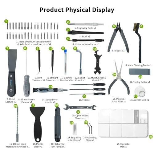 Das 34-teilige Set deckt eine breite Palette von Anwendungen ab, wodurch es ideal für Hobbyisten und Profis gleichermaßen ist. Die Schraubendreherbits sind perfekt für verschiedene Schraubentypen, während die Düsenreiniger sicherstellen, dass deine Drucker immer optimal funktionieren.