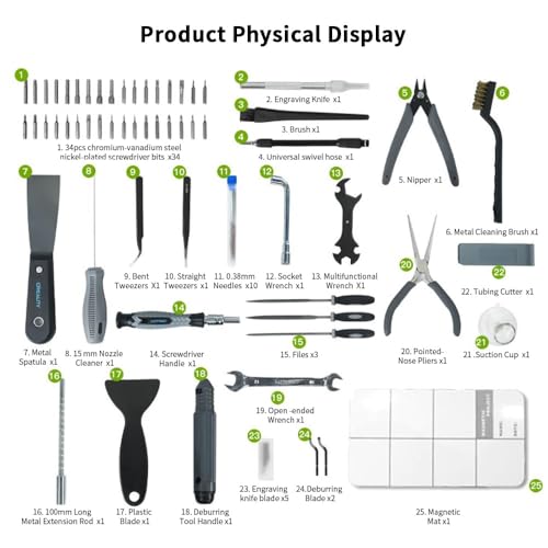 Das Set enthält eine Vielzahl von Werkzeugen, die für unterschiedliche Aufgaben im 3D-Druck geeignet sind. Neben Schraubendrehern und Zangen sind auch spezielle Werkzeuge zur Modellbearbeitung wie Nadelfeilen und Entgratungswerkzeuge enthalten. Dies ermöglicht dir, präzise Anpassungen an deinen Druckerzeugnissen vorzunehmen.
