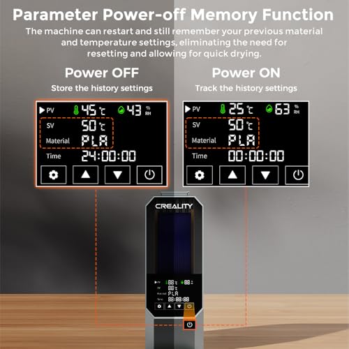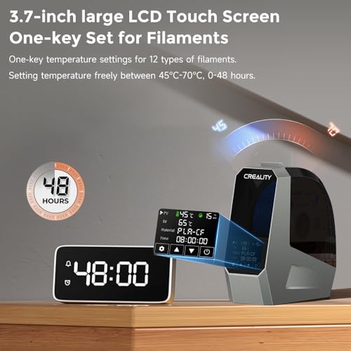 Features | 🔥【360°-Heißluftheizung】🔥 Der Creality Filament Dryer Box heizt mit einem eingebauten Ventilator schnell auf, zirkulierende Heißluft 360° für gleichmäßige Erwärmung, Die Filamentfeuchtigkeit wird effektiv getrocknet und die Druckergebnisse verbessert. Unser Trockner verwendet eine einzigartige 110W PTC Heizung, um den Raum aufzuwärmen. Die PTC Heizung sorgt für eine gleichmäßige Trocknung. Es ist nicht nur langlebig und energiesparend, sondern auch umweltfreundlich., 🔥【LED Touchscreen & Ein-Tasten Set】🔥 Der Creality Space Pi Filament Trockner kommt mit einen neuen 3.7 Zoll Touchscreen für eine einfache Bedienung, sodass Sie die Trocknungsbedingungen ganz einfach verfolgen können. Es hat über Ein-Tasten Temperatureinstellungen für verschiedene Filamenttypen, unterstützt bis zu 12 Arten von Filamenten, einschließlich herkömmlicher und hochleistungsfähiger Verbundwerkstoffe, wie PLA-CF, PA-CF und ASA., 🔥【Frei Anpassen & Einstellen】🔥 Die Heizdauer kann frei von 0–48 Stunden eingestellt werden, sodass die Filamente vollständig getrocknet werden und bessere Druckergebnisse erzielt werden. Natürlich können Sie die Temperatur auch stufenlos zwischen 45℃ und 70℃ einstellen. Sie können zwischen ℃ und ℉ wechseln., 🔥【Parameter Ausschalt Speicherfunktion】🔥 Nach einem Stromausfall, die Maschine kann neu starten und erinnere dich noch an dein vorheriges Material und Temperatureinstellungen erinnern, Das Ausruhen entfällt und ermöglicht ein schnelles Trocknen., 🔥【Breite Kompatibilität】🔥 Die Creality Filament Dry box eignet sich für die meisten verschiedenen Filamenttypen und -durchmesser auf dem Markt, wie Hyper-PLA, PLA, PETG, ABS, TPU, ASA, PP, PC, PA, PET, PLA-CF, PETG-CF, PA-CF. Funktioniert perfekt mit Filamentdurchmessern von 1,75 mm und 2,85 mm. Wir empfehlen dringend, vorab den Creality Space Pi Filament trockner zu verwenden, um in Hochgeschwindigkeitsdruckszenarien zu trocknen., 👍【Offizieller professioneller Support】👍 Um Ihr angenehmes Einkaufserlebnis zu gewährleisten, Creality verfügt über ein professionelles Kundendienstteam, das Ihre Probleme löst. Sollten Sie Probleme haben, zögern Sie bitte nicht, uns zu kontaktieren. Wir bieten einen freundlichen und schnellen Kundenservice, um Ihr Problem innerhalb von 24 Stunden zu lösen. |