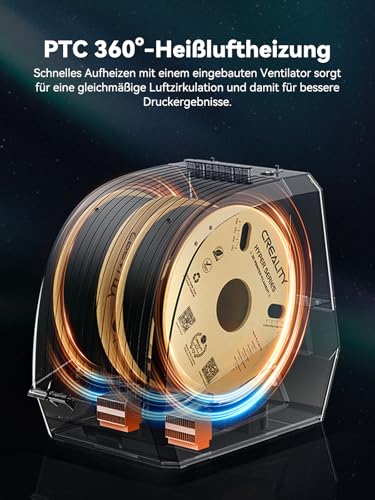Die Hauptfunktion dieses Geräts ist das Trocknen von Filamenten und das erledigt es mit Bravour. Die neue PTC-Heizung sorgt für eine schnelle und gleichmäßige Erwärmung, welche die Feuchtigkeit effektiv entfernt. Die 360° Heißluftzirkulation verteilt die Wärme gleichmäßig und optimiert so den Trocknungsprozess.