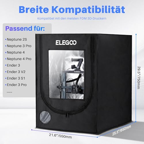 Mit den Abmessungen von 21.6” x 25.5” x 29.5” ist das Gehäuse vielseitig einsetzbar und passt zu vielen gängigen 3D-Druckermodellen wie den Ender 3-Serien und den Neptune-Modelle. Diese breite Kompatibilität macht es zu einer lohnenswerten Investition für verschiedene Nutzer.