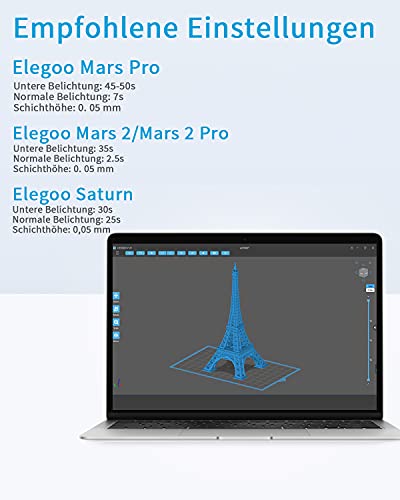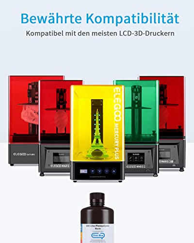 | Features | ▶ Universelle Kompatibilität – ELEGOO Resin ist Kompatibel mit den meisten LCD-3D-Druckern, nicht nur ELEGOO Resin 3D Drucker, ▶ Ausgewogenheit von Zähigkeit und Festigkeit – ABS-Kunststoff bietet eine bessere Flexibilität und Schlagfestigkeit beim Drucken als Standardkunststoff und liefert starke, nicht spröde Ergebnisse. Geruchsarm macht den Einsatz in Innenräumen überschaubar, ▶ Einzigartige Formel für schnelles Aushärten – Nach vielen Anpassungen hat ELEGOO UV Resin eine höhere Liquidität als andere, wodurch der Druck schnell und gut ausgehärtet und einfacher zu entfernen und zu reinigen ist, ▶ Hohe Kompatibilität – ELEGOO 3D Resin 405nm ist nicht nur mit der ELEGOO Mars/Saturn-Serie kompatibel, sondern funktioniert auch gut auf den meisten LCD- und DLP-3D-Druckern. Wildly verwendet für Miniaturen, Schmuck und 3D-Druck zu Hause, ▶ Was Sie erhalten – Gut verpacktes ELEGOO 3D Printer Resin, auslaufsichere Flasche, kollisionssichere Schaumstoffbeutel und unser freundlicher Kundenservice friendly |