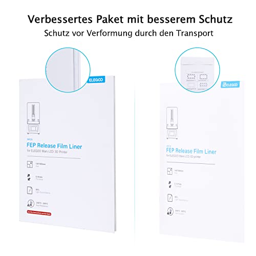 Kompatibel mit ELEGOO Mars und Mars Pro LCD-3D-Drucker; Maße der FEP-Folie: 200 mm * 130 mm * 0,15 mm., Hervorragende Antihaftbeschichtung und geringe Reibungseigenschaften., 95 % Lichtdurchlässigkeit gewährleisten eine optimale UV-Beleuchtung., Hitzebeständige und langlebige Qualität für eine dauerhafte Nutzung., Enthält eine verständliche Anleitung auf der Verpackung, die den Wechsel der FEP-Folie erklärt. Bitte entfernen Sie die doppelseitige Schutzfolie vor dem Gebrauch.