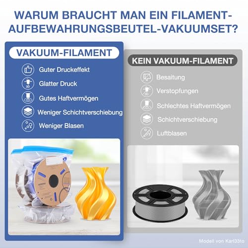 Darüber hinaus wirkt sich die effiziente Vakuumversiegelung positiv auf die Lagerung der Filamente aus, da diese weit weniger anfällig für Feuchtigkeit und Staub sind. Dies trägt wesentlich zur Erhaltung der Qualität der 3D-Druckmaterialien bei.