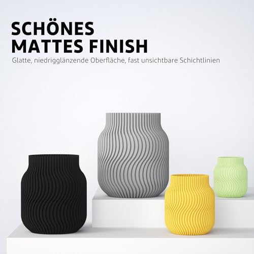 | Features | 【Schönes mattes Finish】ELEGOO MATTE PLA erzeugt ein wunderschönes mattes, wenig glänzendes und glattes Finish, was zu einem gedruckten Objekt mit fast unsichtbaren Schichtlinien führt., 【Erstklassige Genauigkeit und Konsistenz】ELEGOO verwendet fortschrittliche Messverfahren während der Herstellung, um zu garantieren, dass alle Filamente einen Durchmesser von 1,75 mm haben, mit einer Genauigkeit von +/- 0,02 mm, was Konsistenz und Präzision bei jedem Druck gewährleistet., 【Perfekte Wicklung für ein besseres Ergebnis】Jede Spule des Filaments ist sauber gewickelt, was Verwicklungen und Zuführungsprobleme verhindert und perfekte Druckergebnisse liefert., 【Kein Verstopfen & Keine Blasenbildung】ELEGOO PLA Filament wird in einer trockenen und staubfreien Umgebung hergestellt und in einer vakuumversiegelten Verpackung verpackt, weg von jeglicher Feuchtigkeit oder Luft, ohne Probleme mit Verstopfung und Blasenbildung, 【Passend für die meisten 3D Drucker】Universelle Kompatibilität mit allen gängigen 1.75mm FDM 3D Druckern, wie Neptune 3 Serie, Neptune 4 Serie und mehr. Wenn Sie einen geschlossenen Drucker verwenden, halten Sie bitte die Tür offen, wenn Sie ELEGOO MATTE PLA drucken. |
