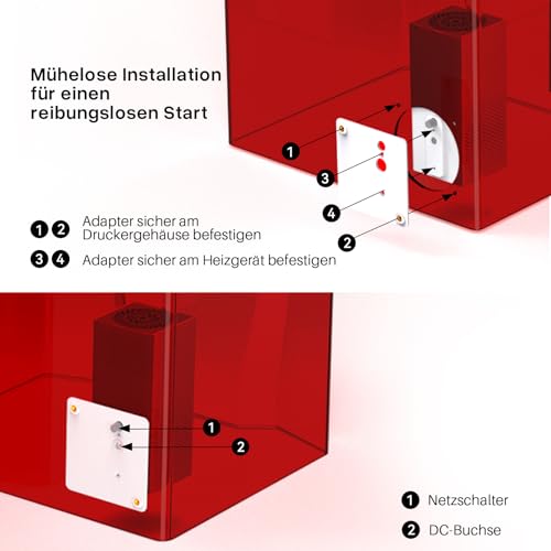Features | 【Intelligente Temperaturregelung für müheloses Drucken】Das ELEGOO Mini-Heizgerät bietet präzise und intelligente Temperaturkontrolle, für optimale Druckqualität vom Start des Drucks bis zur Fertigstellung. Verabschieden Sie sich von frustrierenden Problemen wie Drucke, die sich ungewollt von der Bauplattform ablösen, Verzug und schlechter Haftung zwischen den Schichten., 【Bessere Luftqualität am Arbeitsplatz durch Luftfiltration】Profitieren Sie von der Kombination aus Sauberkeit und Präzision mit dem ELEGOO Intelligent Temperaturregler, das über ein effizientes Luftfiltersystem verfügt, um Verunreinigungen zu entfernen – für einen sauberen Druckerinnenraum., 【Echtzeit-Temperatur-Feedback】Bleiben Sie immer informiert und haben Sie stets die Kontrolle, über die Temperatur im Innenraum Ihres Druckers – dank Echtzeit-Updates, die es Ihnen ermöglichen, temperaturbezogene Probleme schnell zu erkennen und zu beheben, um jederzeit optimale Druckergebnisse sicherzustellen., 【10.000 U/min Hochgeschwindigkeitslüfter für schnells Aufheizen】Ausgestattet mit einem 10.000 U/min Hochgeschwindigkeitslüfter sorgt das Heizungsthermostat für optimalen Luftstrom und gleichmäßige Wärmeverteilung. Durch die konstante Temperatur und das Vermeiden von Hotspots wird ein gleichmäßiges Druckergebnis ermöglicht – für herausragende Druckqualität., 【Hohe Kompatibilität für eine einfache Integration】Vom neuesten Stand der Technik bis zu bewährten älteren Modellen – das Mini Heizgerät ist so konzipiert, dass es nahtlos mit einer Vielzahl von ELEGOO-Druckern, einschließlich Mars 4 Max / DLP, Saturn 4 / 4 Ultra, Saturn 3 / 3 Ultra, Saturn 2 / 8K / S und Jupiter SE, sowie mit Druckern anderer Hersteller verwendet werden kann. Einfach die Größe der Adapterplatte überprüfen und die erforderlichen Perforationen manuell an Ihrem Drucker hinzufügen für eine problemlose Integration des Mini-Heizgeräts., 【Schnelles Aufheizen dank PTC Heizelement – Höchste Geschwindigkeit & Effizienz】Unerreichte Geschwindigkeit und Effizienz, mit der fortschrittlichen PTC-Heiztechnologie des Mini Heizgeräts. Überhitzung wird durch die selbstregulierenden Eigenschaften des PTC-Heizelements verhindert, für mehr Sicherheit während dem Betrieb. |