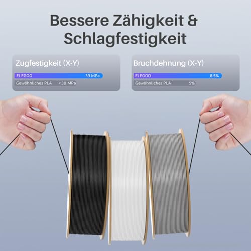 | Features | 30-600mm/s Druckgeschwindigkeit: ELEGOO RAPID PLA+ Filament schmilzt schnell und fließt reibungslos, bis zu 600mm/s Druckgeschwindigkeit. Drucken Sie Projekte schneller, ohne Kompromisse bei der Qualität einzugehen., Erhöhte Festigkeit & Zähigkeit: ELEGOO RAPID PLA plus Filament zeichnet sich durch eine hohe Wölbung und Bruchdehnung aus, was es widerstandsfähig gegen Sprödigkeit und Rissbildung macht und hervorragende Ergebnisse beim Drucken ermöglicht., Weniger Knäuel & sauber gewickelt: Vollständig mechanisches Aufwickeln und strenge manuelle Inspektion stellen sicher, dass alle Hochgeschwindigkeits-Pla-plus-Filamente sauber aufgewickelt sind, wodurch Probleme mit Verwicklungen, Schnappern und Schnurbrüchen wirksam reduziert werden., Erstklassige Genauigkeit und Konsistenz: Ein präziser Produktionsprozess garantiert eine Genauigkeit des Filaments von +/- 0,02 mm. Sorgen Sie für eine reibungslose und gleichmäßige Zuführung der Filamente., Für die meisten 3D-Drucker: Rapid PLA+ Filament eignet sich sowohl für normale Drucker als auch für Hochgeschwindigkeitsdrucker, perfekt für die meisten Hochgeschwindigkeitsdrucker wie Neptune 4, Neptune 4 pro, K1, K1 Max, Ender 5 Serie, Kobra 2, M5, M5C, und mehr |