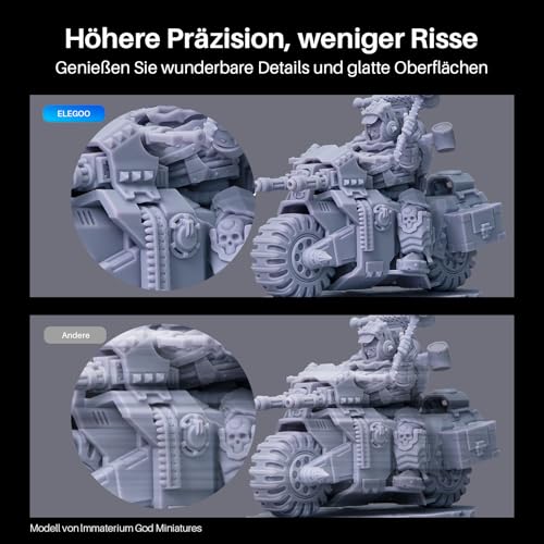 Die Druckqualität des ELEGOO Resins ist bemerkenswert. Die optimierte Formel ermöglicht eine exzellente Detaildarstellung sowie seidig glatte Oberflächen auf den gedruckten Modellen. Dies ist besonders wichtig für Modellbau und komplexe Designs, bei denen selbst kleinste Details entscheidend sind.