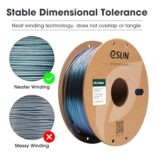 Features | 【Dual-Color Magic PLA】:eSUN ePLA-Magic pla wird auf der Basis von gewöhnlichem PLA-Material modifiziert, so dass es nicht nur die Eigenschaften von PLAs einfacher Druckfähigkeit beibehält, sondern auch eine fantastische zweifarbige, funkelnde Textur hinzufügt., 【Twinkling Appearance】:eSUN ePLA-Magic pla, inspiriert von der Milchstraße, wird durch die Verwendung der dunklen Nacht als Hintergrund und das funkelnde Sternenlicht als Hintergrund geschaffen, die sich verflechten und verändern, um dem Modell ein schillerndes Aussehen zu geben., 【Stabile Maßtoleranz】: eSUN ePLA-Magic pla hat eine minimale Toleranz und geringe Verformung, um eine konsistente Zuführung und stabile Drucke, eine gute Schichtbindung, weniger Fadenbildung, keine Blasen und keine Risse zu gewährleisten, was zu einer hervorragenden Oberflächenqualität und einer hohen Präzision führt., 【Tangle Free & No Plugging】: eSUN ePLA-Magic pla hat eine gute Rundheit, eine sehr enge Durchmessertoleranz und eine gute Wicklung, und es überlappt oder verheddert sich nicht. Und es kann in vielen Bereichen wie kulturelle Kreativität, Animationsindustrie, Film- und Fernsehrequisiten, etc. angewendet werden., 【Vakuumierte versiegelte Verpackung】: eSUN ePLA-Magic pla wird in einem versiegelten Vakuumbeutel mit einem Trockenmittelbeutel geliefert, halten Sie Ihre 3D-Drucker-Filamente einfach in einem optimalen Lagerzustand und frei von Staub oder Schmutz, bevor Sie die vakuumierte versiegelte Verpackung öffnen. |