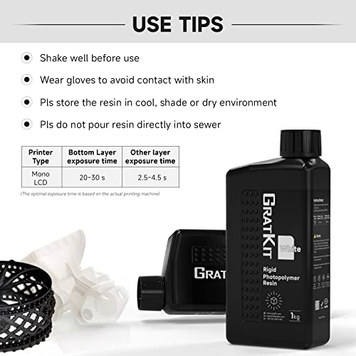 Features | 【High Precision and Low Shrinkage】GratKit M5 Standard resin is designed with low volume shrinkage and high printing accuracy during the UV-curing, ensuring the printed model with smooth surface and outstanding detail;, 【Good Fluidity and Low Viscosity】GratKit Standard resin has near water-like fluidity and low viscosity, which can increase the printing success rate;, 【Low Odor and Safe】GratKit resin is manufactured with high quality raw materials, with extremely low odor, easy to clean; which can provide you with a better printing experience;, 【Upgraded Bottle Design】GratKit 3D Printer Resin is packed in Impact resistant bottles with leak-proof AL foil, self-designed seal breaker on Lid and anti-slip design on Bottle;, 【Wide Compatibility】GratKit Standard is highly compatible with all mainstream 405nm DLP/LCD 3D printers printers from manufacturers like Nova3d, QIDI TECH, Phrozen, Creality, Anycubic, Elegoo. |