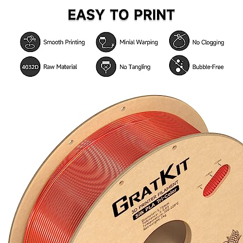 【Magischer Dreifarbeffekt】Das GratKit Tricolor Silk PLA Filament vereint 3 Farben in einem einzigen Filamentstrang und erzeugt so einen beeindruckenden Farbwechseleffekt bei Ihren 3D-Drucken, 【Seidenglänzendes Coextrusion PLA】Das GratKit Silk-Coextrusion-PLA verleiht Ihren Druckobjekten einen ansprechenden Seidenglanz und lässt sie charmant und hochwertig erscheinen, 【Breite Kompatibilität】Ausgezeichnete Haftung auf dem Druckbett; Kompatibel mit den meisten gängigen FDM 3D-Druckern wie Ender 3, Neptune 3 & 4, Kobra 2 usw, 【Feuchtigkeitsbeständig】GratKit Filamente kommen mit einem wiederverschließbaren Beutel zum Schutz vor Feuchtigkeit und sind vorgetrocknet. Feuchtigkeitsbeständiger Klebstoff für längere Haltbarkeit der Spule, 【Umweltfreundliche Verpackung】Für das GratKit PLA 3D-Drucker-Filament werden recycelbare Kartonspulen verwendet, um die Umwelt zu schonen
