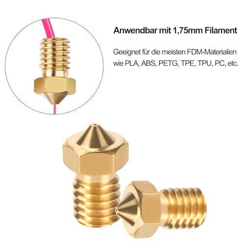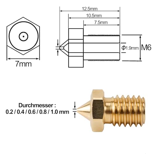 | Features | Was Sie bekommen: Diese Messingdüsen Kit enthalten 20PCS 0,4mm, 5PCS 0,2/0,6/0,8/1,0mm Düsen, 7mm Gabelschlüssel, 5pcs Düsenreinigungsnadeln und 1pcs gebogene Pinzette, geeignet für die meisten FDM-Materialien wie PLA, ABS, PETG, TPE, TPU, PC, etc, Vielseitige Kompatibilität: Dieses Düsenkit lässt sich nahtlos in eine breite Palette von 3D-Druckern integrieren und bietet eine einfache Installation und Kompatibilität mit allen führenden Marken. Kompatibel mit Anycubic i3 Mega, i3 Mega S, i3 Mega X, i3 Mega Pro, Kobra Neo, Kobra Go, Chiron, Predator, für Prusa i3 MK3, Mini+, für Phaetus Dragon, Dragonfly, für E3D V5 V6 Hotend und anderen kompatiblen Modellen, die ein konsistentes Druckerlebnis bei verschiedenen Setups bieten, Handwerkskunst neu definiert: Diese aus hochwertigem Messing gefertigten 3D-Drucker-Extruderdüsen verfügen über eine bessere Wärmeleitfähigkeit und eine hohe Härte, halten extremen Temperaturen stand und sind verschleißfest für eine gleichbleibende, langlebige Leistung über ein breites Spektrum von Druckprojekten, Fließend in der Kreation: Das sorgfältig konzipierte Fließprofil der Düse garantiert einen ununterbrochenen Materialfluss und eine gleichmäßige Extrusionsrate. Glatte Innenwand ohne Grat, geringerer Viskositätskoeffizient, sanfterer Abstich. Verabschieden Sie sich von frustrierenden Druckunterbrechungen aufgrund von Verstopfungen – diese Düse sorgt für ein reibungsloses und zuverlässiges Druckerlebnis., Perfekter Druck: Diese mit höchster Präzision konstruierte Düse ist der Inbegriff von Detailtreue und ermöglicht eine beispiellose Kontrolle und Genauigkeit bei Ihren Drucken. Von filigranen Prototypen bis hin zu komplexen Entwürfen stellt sie sicher, dass jede Schicht einwandfrei und originalgetreu reproduziert wird. |
