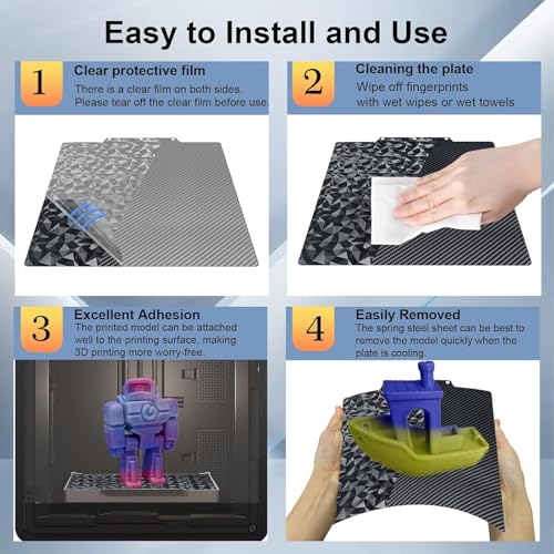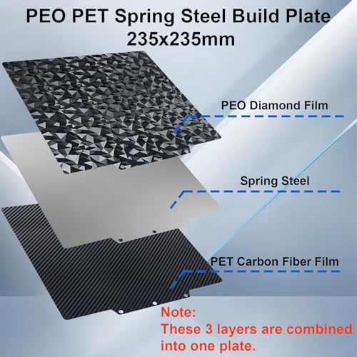 | Features | 【Breite Anwendung】 Die Größe der 235×235 mm großen PEO-PET druckplatte mit 3 speziellen Schraubenlöchern passt perfekt zur Flashforge Adventurer 5M- und Adventurer 5M Pro 3D Druckerplattform., 【PEO+PET Build Plate】 PEO-PET-Platte mit Kohlefaser-PET auf der einen Seite und einer einzigartigen PEO-Folie auf der anderen. Die PEO-Oberfläche weist im Gegenlicht betrachtet Sechsecke auf. Die PETdruckplatte weist eine Oberfläche aus Kunstkohlefaser auf und bietet eine unverwechselbare und hochwertige Optik., 【Hohe Temperaturbeständigkeit】 Die Oberfläche der PEO-PET-druckplatte ist beständig gegen hohe Temperaturen von 180 °C und mit Filamenten wie PLA/PETG/TPU/ABS kompatibel. Wenn Sie Hochtemperaturfilamente wie ABS drucken, müssen Sie den Druck möglicherweise versiegeln oder Klebstoff auf die Platte auftragen, um die Haftung zu verbessern., 【Müheloses Entfernen】 PEO PET spring steel platte ist flexibel, da es den zahlreichen Wärmezyklen standhält, die ein 3D-Druckbett von Druck zu Druck durchläuft. Warten Sie nach Abschluss des Druckvorgangs, bis die druckplatte und der Druck abgekühlt sind. Biegen Sie dann das Blech und Sie können das Modell problemlos abnehmen., 【Wartung der Bauplatte】 Staub- und Fettablagerungen auf der Plattform können die Haftung verringern. Für optimale Haftung ist es ratsam, die Oberfläche regelmäßig mit Wasser und einem Reinigungsmittel zu reinigen. |