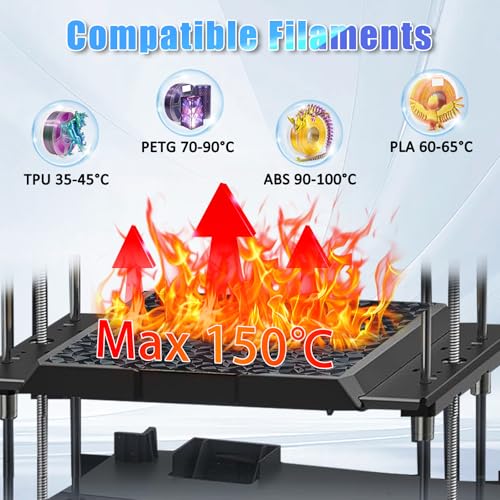 Mit einer maximalen Temperatur von 150 °C ist diese Druckplatte vielseitig einsetzbar und kann für viele gängige Filamente verwendet werden. Bei Temperaturen, die für verschiedene Materialien empfohlen werden, bietet die Platte gleichbleibende Qualität und Zuverlässigkeit.