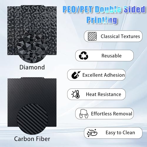 | Features | 【Doppelseitiger holografischer PEO PET Effekt】 Die Bauplatte der PEO-Seite weist Rautenmuster auf und die PET-Seite zeigt Kohlefasermuster mit glatter Textur auf beiden Seiten, was Ihren Drucken ein hochwertiges Gefühl verleiht., 【Hervorragende Haftung】 Die Drucke können fest auf der druckplatte angebracht werden. Bitte beachten Sie, dass Sie die build plate oberfläche regelmäßig mit Alkohol oder einem Reinigungsmittel reinigen müssen, da Schmutz und Öl die Druckhaftung verringern und die Klarheit der holografischen Muster beeinträchtigen können., 【Hohe Temperaturbeständigkeit】 Die maximale Temperatur der PEO-PET-Oberflächen plate beträgt 150 °C. Die empfohlene Temperatur für die Filamente beträgt PLA 60–65 °C; PETG 70–90 °C; ABS 90–100 °C; TPU 35–45 °C., 【Müheloses Entfernen】 PEO PET Federstahl platte mit Flexibilität und hoher Ebenheit. Drucke auf der Oberflächenplatte lösen sich leicht, wenn die Plattentemperatur auf Raumtemperatur abfällt, und wenn der Druck noch immer an der Platte klebt, lässt er sich durch leichtes Biegen der druckplatte lösen. Sie brauchen kein Werkzeug., 【Lieferumfang】1 x PEO PET druckplatte 250 x 250 mm (KEINE MAGNETISCHE DRUCKBETT), kompatibel mit für Ankermake M5, für Qidi Q1 Pro 3D-Drucker. |