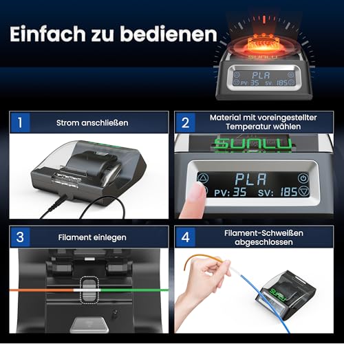 Der Filamentverbinder bietet eine benutzerfreundliche Ein-Klick-Bedienung, die selbst für Anfänger leicht verständlich ist. Die vorprogrammierte Temperaturkontrolle sorgt dafür, dass du schnell und ohne technische Kenntnisse Ergebnisse erzielen kannst.