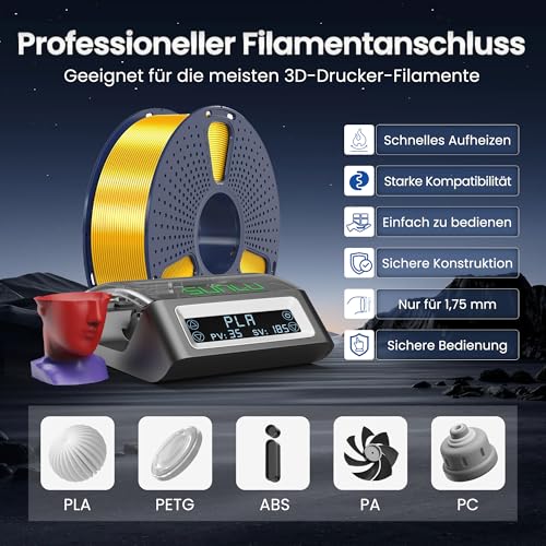 | Features | Abfall reduzieren, Filament maximieren: Verwenden Sie gebrochene oder übrig gebliebene Filamentstücke mühelos wieder, indem Sie sie zusammenfügen. Reduzieren Sie Abfall und nutzen Sie jede Filamentrolle optimal aus. Eine nachhaltige Lösung, die Ressourcen spart und Kosten senkt, Kreatives Multi-Color-Drucken: Filamente aus demselben Material, aber in verschiedenen Farben verbinden, um Erstellen Sie beeindruckende Mehrfarbdrucke: Verbinden Sie Filamente aus demselben Material, jedoch in verschiedenen Farben, und erstellen Sie mühelos lebendige, mehrschichtige Modelle und personalisierte 3D-Drucke. Perfekt, um Ihren Projekten eine individuelle Note zu verleihen, Schnelles und präzises Erhitzen: Erhitzt sich in nur 3 Minuten auf 185 °C, mit präziser Temperaturkontrolle (±3 °C) und einer maximalen Temperatur von 240 °C. Gewährleistet eine schnelle und zuverlässige Leistung, die Ihre 3D-Druck-Workflows optimiert, Breite Materialkompatibilität: Unterstützt verschiedene 1,75-mm-Filamente wie PLA, PETG, ABS, TPU, Nylon und PC. Ob für filigrane oder anspruchsvolle Projekte, der Verbinder liefert exzellente Schweißergebnisse bei unterschiedlichsten Materialien, Benutzerfreundliche Bedienung mit visueller Überwachung: Mit Ein-Klick-Bedienung und voreingestellten Temperaturoptionen ist die Handhabung einfach. Eine integrierte visuelle Schnittstelle ermöglicht die Echtzeitüberwachung des Prozesses. Ideal für Anfänger und Profis |