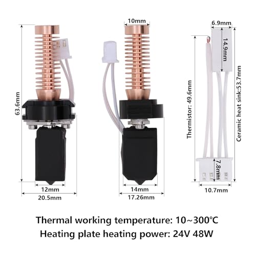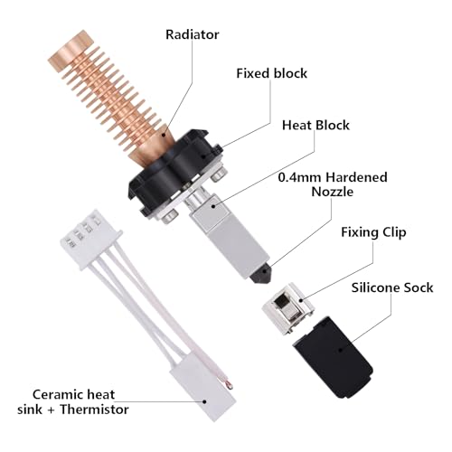 | Features | Kompatible Modelle: Das Keramik Hotend Kit für Flashforge Adventurer 5M/5M Pro 3D-Drucker., Integrierter Halsheizblock: Die neue Version verfügt über ein schnell abnehmbares Design, austauschbare Düsen, eine verlustfreie Installation und verbessert die Erfolgsquote beim Drucken von Modellen., Abnehmbare Düsen: Verbesserte 0,4-mm-Düse aus gehärtetem Stahl, hohe Temperaturbeständigkeit, Verschleißfestigkeit, längere Lebensdauer., Schnelleres Aufheizen: Ausgestattet mit einer 0,2/0,4/0,6-mm-Düse aus gehärtetem Stahl können Kohlefasern und ABS-Nylonmaterialien mit einer Heizleistung von 50 W bedruckt werden, und die maximale Temperatur kann 280 °C erreichen., Lieferumfang: 1 Hotend-Kit (Kühler, fester Block, Wärmeblock, 0,2/0,4/0,6 mm gehärtete Düse, Keramik-Kühlkörper, Thermistor, Silikonsocke, Befestigungsclip). |