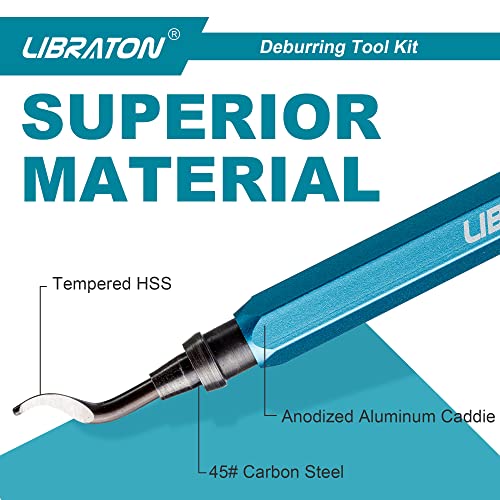 Der Libraton Entgrater besticht durch seine erstklassige Verarbeitungsqualität. Der Aluminiumgriff liegt angenehm in der Hand und ermöglicht ein präzises Arbeiten. Die Klingen bestehen aus HSS (hochlegiertem Schnellstahl), der besonders langlebig und robust ist.
