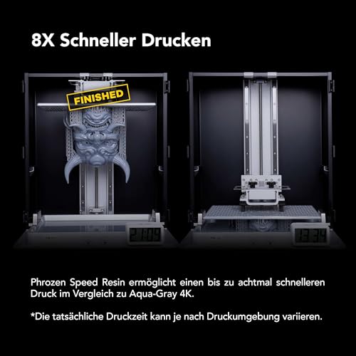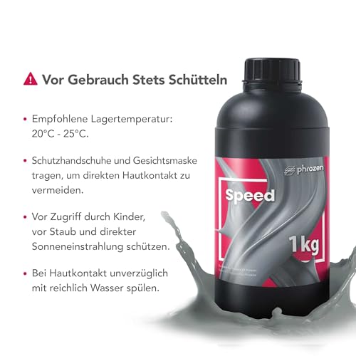 Features | 【Rasende Geschwindigkeit】Das Phrozen Speed Resin ist dank seiner niedrigen Viskosität speziell darauf ausgelegt, Belichtungs- und Aushärtezeiten zu reduzieren. Selbst große Modelle bis 24 cm können in unter 6 Stunden gedruckt werden., 【Zeitsparende Druckerfahrung】Im Vergleich zu herkömmlichen Harzen ermöglicht dieses hochgeschwindigkeitsfähige Harz einen bis zu 8-mal schnelleren Druckprozess, wodurch langwierige Druckvorgänge erheblich verkürzt werden., 【Schnell und Stabil】Mit einer Härte von 79 Shore D bietet Speed Resin eine hohe Geschwindigkeit beim Drucken, ohne dabei an Stabilität zu verlieren – ideal für Projekte, die sowohl Effizienz als auch Langlebigkeit erfordern., 【Breite Kompatibilität】Dieses Harz ist kompatibel mit einer Vielzahl von LCD/DLP/SLA-Druckmaschinen und ideal geeignet für den Druck von lebensgroßen Prototypen, Schuhen oder Landschaftsprojekten., 【Benutzerzentrierte Sicherheit】Das auslaufsichere und geruchsarme Resin gewährleistet eine sichere und angenehme Nutzung in jeder Arbeitsumgebung. |