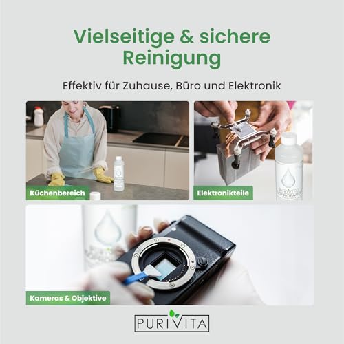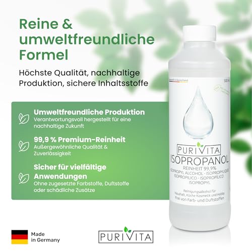 PURIVITA ISOPROPANOL – Reinigungsalkohol – 99,9% Reinigungskraft – Reiniger für Haushalt, Industrie, Elektronik – Entfettungs + Lösungsmittel – rückstandsfrei – nicht leitend – 1x500ml