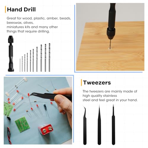 Die Vielseitigkeit des Werkzeugsets ist bemerkenswert. Mit 13 verschiedenen Schnitzmessern und 12 Feilen hast du für nahezu jeden Anwendungsfall das passende Werkzeug zur Hand. Ebenso ermöglichen die Zangen und Pinzetten präzise Arbeiten in schwer zugänglichen Bereichen.