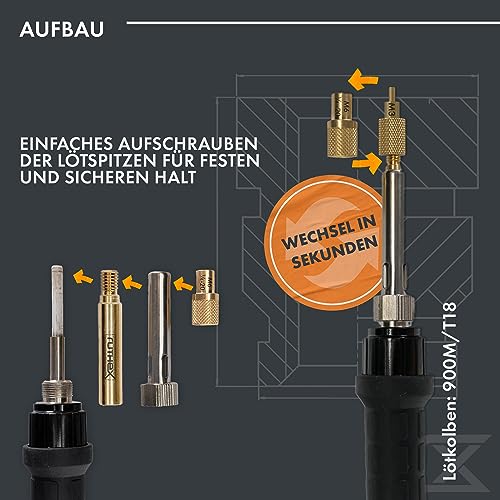 - Ein praktisches Wechselssystem ermöglicht einen einfachen Austausch der Spitzen ohne Demontage des Lötkolbens.