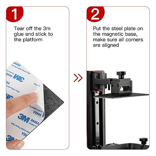 Kompatibel mit Saturn 2 8K, Saturn 8K SLA 3D-Drucker, Flexible Stahlplatte mit hohem Chromgehalt, leicht zu biegen und zu reinigen, Erleichtern Sie das Entfernen von Ausdrucken und vermeiden Sie Schäden während des Vorgangs, insbesondere bei kleinen gedruckten Modellen. Mit gute Korrosionsbeständigkeit und Rostschutz. Die gebürstete Oberfläche sorgt für eine bessere Haftung und sorgt für einen perfekten Druck., Die Magnetbasis bietet leistungsstarke Magnete und sorgt für eine perfekte Passform mit der Stahlplatte. Der 3M-Klebstoff hat eine starke Viskosität und einen guten Klebstoff bei niedriger Temperatur, um ein Herunterfallen nach dem Verkleben mit der Plattform zu erschweren., Die zwei einfachen Hebelaschen (Griffe) erleichtern das Entfernen der Stahlplatte von der Magnetbasis. Mit der Ersatzstahlplatte können Sie kontinuierlich drucken. Starten Sie den Druckvorgang erneut, bevor Sie mit der Reinigung beginnen. Sparen Sie Zeit., Bitte reinigen Sie die Bauplatte mit Alkohol, um sicherzustellen, dass kein Harz oder Staub auf der Oberfläche zurückbleibt. Halten Sie es sauber und trocken. Sie müssen die Magnetbasis auf die Bauplatte kleben und verdichten, um sicherzustellen, dass keine Blasen entstehen. Sonst würde sich der Magnetfuß ablösen. Bitte warten Sie 72 Stunden nach der Installation und vor dem Drucken.