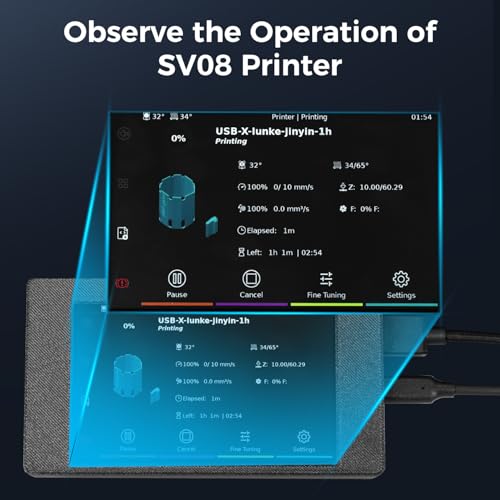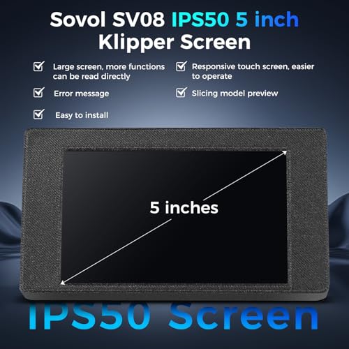 Features | Excellent Image Quality – Sovol 5 inch IPS capatitive touch screen with a resolution of 800×480 provides high definition and rich colors. It fits for Sovol SV08 3d printer., Prints Preview – SV08 HD screen can display the shape of the prints preview. Compared with the knob screen, the operation is more convenient. You don’t need to look up the file name and can easily find the print file you want., Display Real-time Printing Process – Thanks to the camera, you can see the real-time printing effect of the prints on this screen., Visualize the Temperature Change Curve – This HD screen can help you to observe the temperature of the hot bed and nozzle in real time., More Information Provided on This Screen – SV08 HD screen can display the real-time printing progress of the prints and monitor the prints completing time. It can display the real-time printing speed and monitor the extrusion flow rate. It can also display the actual printing time and the remaining printing time of the prints., Sovol SV08 HD display comes with a desktop stand. You can connect the wiring and put it on your desk. Or if you want to hang it on the position where the knob screen is, you can download a bracket file from Sovol Official Website and print it. |