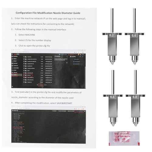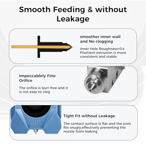 | Features | Sovol SV08 Metalldüse mit hohem Durchfluss und Heizblock Kit, 0,2 mm x 1 Stück/0,4 mm x 1 Stück/0,6 mm x 1 Stück/0,8 mm x 1 Stück 3D Drucker Düsen für SV08/T300 insgesamt 4 Stück, Der Heatbreak besteht aus einer Titanlegierung, die die Wärmeleitung effektiv reduziert. Der Heatbreak aus Titanlegierung sitzt eng am Heizblock und verhindert effektiv ein Auslaufen während des Druckens. Die Innenwand des Heatthroat aus Titanlegierung ist glatt, mit einer Rauheit von weniger als 0,4, was einer reibungslosen Zufuhr der Filamente förderlich ist, Die Düse besteht aus einer Kupferlegierung und ist kompatibel mit PLA, ABS, PETG, TPU, PP, PC, PLA-CF, PA-CF, PET-CF und anderen Filamenten, 0,2-mm-Düse: Beste Druckgenauigkeit und Oberflächendetails: Eine Düse mit kleinerem Durchmesser kann detailliertere und glattere Oberflächen drucken, 0,6-mm- und 0,8-mm-Düsen: Schnellere Druckgeschwindigkeit: Je größer der Düsendurchmesser, desto mehr Filament kann pro Sekunde extrudiert werden, desto schneller ist die Druckgeschwindigkeit und die erste Schicht ist fester und weniger anfällig für Verstopfungen |