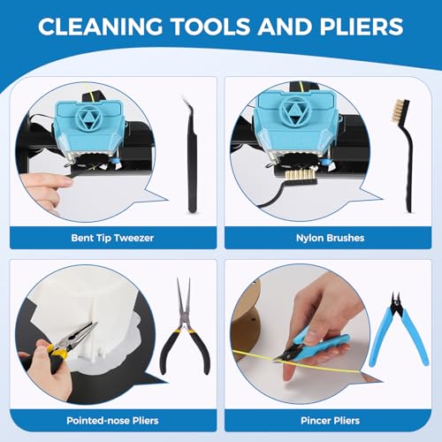 | Features | 3D-Drucker-Werkzeugsatz mit insgesamt 36 Teilen, einschließlich 1 * digitaler Messschieber, 3 * verschiedene Spatel, 1 * Entgratungswerkzeug und zusätzliche 10 * Klingen, 1 * Pinzette, 1 * Reinigungsbürste, 2 * Zangen, 1 * Schnitzmesser und zusätzliche 5 * Klingen, 6 * Nadelfeilen, 1 * Fingerling, 1 * Finishing-Bürste, 2 * Garnstreifen und 1 * Aufbewahrungstasche., Präziser digitaler Messschieber: Der digitale Messschieber aus Kunststoff ist überraschend präzise und praktisch für schnelle Messungen, z. an Kalibrierungswürfeln. Die digitale Anzeige erleichtert das Ablesen enorm. Mit einem Messbereich von 10 cm ist er für den täglichen Gebrauch ausreichend, Werkzeuge zum Entfernen und Fertigstellen: Die mitgelieferten Rakel eignen sich perfekt zum Entfernen von Drucken von der Druckplatte, selbst von hartnäckigsten. Die verschiedenen Größen und Formen helfen, auch hartnäckige Drucke zu entfernen, ohne sie zu beschädigen., Der Entgrater ist besonders nützlich, um kleine Grate zu entfernen und Kanten zu verfeinern.Die Pinzette ist ideal zum Greifen kleiner Teile oder zum Entfernen von Filamentresten aus schwer zugänglichen Bereichen des Druckers.Die robuste Drahtbürste eignet sich hervorragend zur Reinigung der Druckplatte und anderer Druckerkomponenten. Sie entfernt auch hartnäckigen Schmutz und ist eines der wichtigsten Werkzeuge im Set., Die beiden mitgelieferten Zangen sind vielseitig einsetzbar, zum Schneiden von Filament oder zum Greifen und Festhalten von Kleinteilen während der Nachbearbeitung.Das scharfe und präzise Schnitzmesser ist ideal für feine Detailarbeiten und zum Entfernen von Filamentresten., Die Nadelfeilen sind ideal für Detailarbeiten und zum Glätten kleiner Flächen und Kanten.Der Fingerling schützt die Finger bei Arbeiten am Hotend. Einfach, aber wirkungsvoll und praktisch. |
