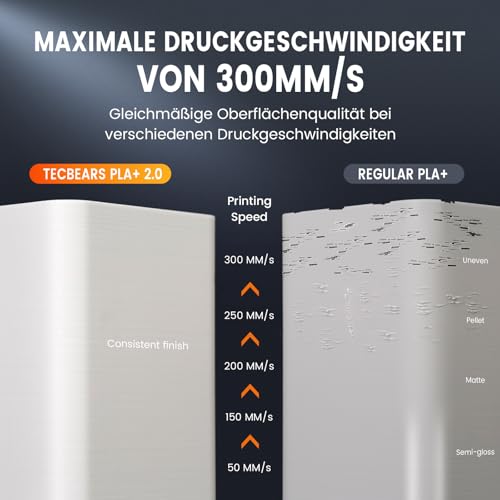 | Features | VERBESSERTE ZÄHIGKEIT UND STEIFIGKEIT:Im Vergleich zu ähnlichen Produkten auf dem Markt hat TECBEARS PLA+ Filamenthat einen höheren Biegemodul und eine höhere Bruchdehnung, wodurch es widerstandsfähiger gegen Sprödigkeit und Risse ist. Ideal für funktionale Teile., 0-300MM/S DRUCKGESCHWINDIGKEIT:Das PLA+ Filament eignet sich für Druckgeschwindigkeiten von 0-300mm/s. Drucken Sie Ihr Projekt schneller, ideal für normale und Hochgeschwindigkeits-3D-Drucker., GLÄNZENDE OBERFLÄCHE & ZUVERLÄSSIGE HAFTUNG:TECBEARS PLA+ Filament bietet eine ausgezeichnete Schichtbindung für eine glatte Oberfläche ohne Delamination. Geringes Schrumpfen sorgt für eine feste Haftung am Druckbett und verhindert Verziehen und Ablösung., KEINE VERSTOPFUNGEN, KEINE BLASEN:Die Durchmesser-Toleranz des PLA PLUS Filaments von +/- 0,02 mm gewährleistet eine reibungslose Extrusion und verhindert Düsenverstopfungen. Jede Rolle wird 24 Stunden lang getrocknet und ist in einer wiederverschließbaren Vakuumverpackung versiegelt., VERWICKLUNGSFREIE WICKLUNG:Mit einer Gesamtlänge von 330m wird das PLA+ Filament sauber gewickelt, um Verwicklungen und Linienbrüche zu minimieren. Inklusive Filament-Schnurclips für eine verwicklungsfreie Nutzung. |