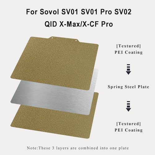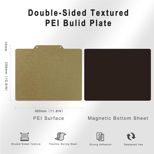 | Features | Strukturierte Oberfläche aus PEI-Federstahl: Größe 300×255 mm/11.8 x10.0 inch. Die goldgelbe, matte Oberfläche mit PEI-Pulverbeschichtung weist eine starke Hitzebeständigkeit, Flammwidrigkeit, Abriebfestigkeit und hohe Druckstabilität auf. Die TIOPY PEI-Federstahl kann Temperaturen von bis zu 200°C standhalten, Kompatibler Filamente & 3D Drucker: Kompatibel mit PLA, PETG, ABS, TPU, ASA, Nylon und Polycarbonat .300×255 mm(11.8"x10.0") Federstahlblech 3D-Druckerbett für 3D-Drucker mit Plattformgröße von 300 x 255, für Sovol SV01/SV01 Pro SV02 QIDI X-Max/X-CF Pro und andere FDM 3D-Drucker Betten gleicher Größe, Einfache Installation: Die TIOPY PEI-Platte besteht aus 2 Teilen, einer flexiblen Stahlplattform mit strukturiertem PEI auf beiden Seiten und einer Magnetische Basis mit Klebstoff auf der Rückseite. Kleben Sie einfach die magnetische Unterplatte auf Ihr beheiztes Bett und platzieren Sie dann die Stahlplattform mit PEI-Oberfläche auf der Oberseite, Einfaches Entfernen der Drucke: Einfaches Anbringen der Filamente am Druckbett. Sie benötigen kein Klebeband und Kleber, die Ihnen die Angst vor dem Drucken nehmen. Die Drucke lassen sich leicht entfernen. Nehmen Sie einfach die PEI-Folie heraus und biegen Sie sie wiederholt leicht, um Ihre Drucke sofort abzulösen, Warme Note: Sie sollten die Druckplattform wegen der verschiedenen Größen des Druckbettes neu ausrichten. Eine heiße Druckerdüse beschädigt die Druckoberfläche. Ein kleiner Spalt zwischen der Düse und der Oberfläche beim Nivellieren der Plattform ist perfekt, was eine gute Haftung bietet und das Entfernen der gedruckten Modelle erleichtert |
