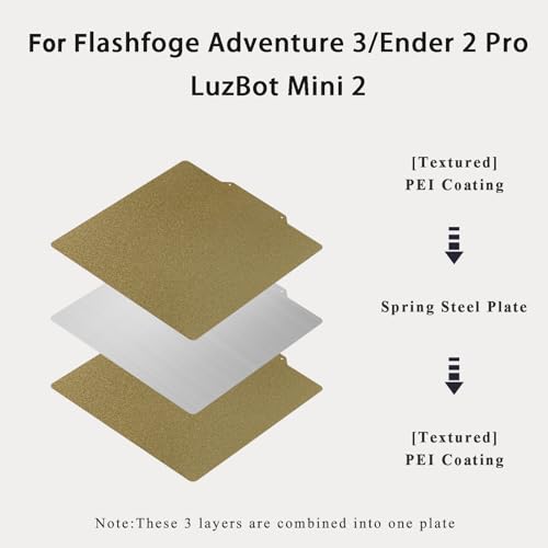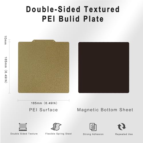 | Features | Strukturierte Oberfläche aus PEI-Federstahl: Größe 165×165 mm/6.49 x6.49inch. Die goldgelbe, matte Oberfläche mit PEI-Pulverbeschichtung weist eine starke Hitzebeständigkeit, Flammwidrigkeit, Abriebfestigkeit und hohe Druckstabilität auf. Die TIOPY PEI-Federstahl kann Temperaturen von bis zu 200°C standhalten, Kompatibler Filamente & 3D Drucker: Kompatibel mit PLA, PETG, ABS, TPU, ASA, Nylon und Polycarbonat .165×165 mm(6.49"x6.49") Federstahlblech 3D-Druckerbett für 3D-Drucker mit Plattformgröße von 165 x 165, für FlashForge Adventurer 3/Ender 2 pro/LulzBot Mini 2 Desktop und andere FDM 3D-Drucker Betten gleicher Größe, Einfache Installation: Die TIOPY PEI-Platte besteht aus 2 Teilen, einer flexiblen Stahlplattform mit strukturiertem PEI auf beiden Seiten und einer Magnetische Basis mit Klebstoff auf der Rückseite. Kleben Sie einfach die magnetische Unterplatte auf Ihr beheiztes Bett und platzieren Sie dann die Stahlplattform mit PEI-Oberfläche auf der Oberseite, Einfaches Entfernen der Drucke: Einfaches Anbringen der Filamente am Druckbett. Sie benötigen kein Klebeband und Kleber, die Ihnen die Angst vor dem Drucken nehmen. Die Drucke lassen sich leicht entfernen. Nehmen Sie einfach die PEI-Folie heraus und biegen Sie sie wiederholt leicht, um Ihre Drucke sofort abzulösen, Warme Note: Sie sollten die Druckplattform wegen der verschiedenen Größen des Druckbettes neu ausrichten. Eine heiße Druckerdüse beschädigt die Druckoberfläche. Ein kleiner Spalt zwischen der Düse und der Oberfläche beim Nivellieren der Plattform ist perfekt, was eine gute Haftung bietet und das Entfernen der gedruckten Modelle erleichtert |