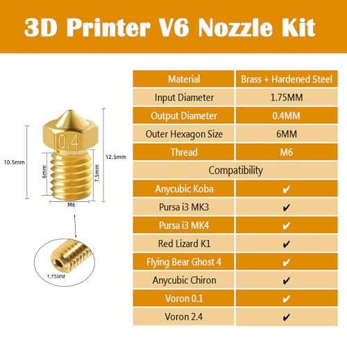 | Features | TIOPY 3D Drucker V6 Düsen Spezifikation: Eingangsdurchmesser: 1.75 mm; Ausgangsdurchmesser: 0.4 mm; Schraubgewinde: M6 Thread Connection.Suit für alle Filament mit Durchmesser 1.75 mm(PLA、ABS、PETG、TPE、TPU、PC), Hochwertiges Material: Unser Düsensatz besteht aus gehärtetem Stahl und Messing, die abriebfest und hitzebeständig sind, um Haltbarkeit und lange Lebensdauer zu gewährleisten, Weite Kompatibilität: TIOPY 3D Drucker V6 Düsen Kit kompatibel mit Pursa i3,MK3,MK3S,Anycubic i3 Mega,Mega S,Mega Pro,Mega X,Anycubic Chiron,AnycubicKobra,Voron 0.1Voron 2.4,flying bear Ghost 4/4s/5,Red Lizard K1hotend,dragon hotend, Bi-mega v5 hotend etc, Paket beinhaltet: 2PCS gehärtete Stahl V6 Düse und 8PCS Messing Hochtemperatur V6 Düsen, dieses Kit enthält insgesamt 10 PCS 0.4 mm Düsen in zwei Materialien, Warme Anmerkung: Alle Fragen wenden Sie sich bitte an uns, wir werden innerhalb von 12 Stunden antworten |