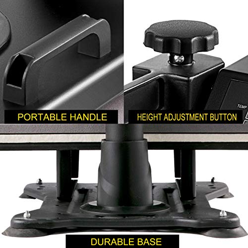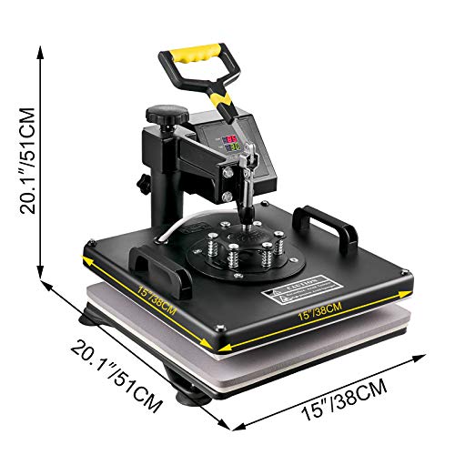| Features | AUSGEZEICHNETE QUALITÄT – Mit einer 38 x 38 cm großen Heizplatte bietet die Wärmepresse eine große Oberfläche für die Übertragung auf Gegenstände mit flacher Oberfläche. Die mit Teflon beschichtete Walze ist antihaftbeschichtet und stabil und verhindert das Anbrennen von Übertragungen., SCHAUKELFUNKTION – Der Schwenkarm ist vollständig um 360 Grad gedreht, sodass sich das Heizelement sicher zur Seite bewegen kann, wodurch die Wahrscheinlichkeit eines versehentlichen Kontakts verringert wird. Dadurch wird der Druck direkt und gleichmäßig nach unten ausgeübt, was die Qualität des fertigen Getriebes verbessert., GENAUE DIGITALE STEUERUNG- Ausgestattet mit einer genauen digitalen Zeitschaltuhr und Temperaturregelung können Sie die Maschine je nach Material auf die gewünschte Zeit und Temperatur einstellen. Der akustische Alarm ertönt und das Element hört auf zu heizen, wenn die eingestellte Zeit und Temperatur erreicht sind., EINSTELLBARE FEDERPLATTE – Die Mehrfederdruckplatte mit runder Form ermöglicht eine gleichmäßigere Druckverteilung auf die gesamte Platte. Abgesehen davon ist die Montage einfach und bequem., MEHRFACHANWENDUNG – Unsere wirtschaftliche und praktische Heißpresse ist weitverbreitet. Die Heißpresse 8 in 1 kann für Hüte, Mützen, T-Shirts, Tassen, Teller usw. verwendet werden, wodurch Kosten gespart und der Prozess reduziert werden. |