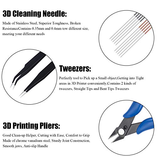 | Features | ✔️ PAKETINHALT: 31 STÜCK perfektes Werkzeugset: 10 Stück Reinigungsnadeln, 2 Stück Pinzette, 1 Stück Zange, 2 Stück Scarper, 10 Stück Reinigungsschneider-Kit, 1 Stück Carving Cutter mit 5 Stück Ersatzschneider., ✔️ LEICHT & TRAGBAR: Dieses 3D-Druck-Toolkit ist bei Verlust und Beschädigung durch eine praktische Reißverschlusstasche geschützt. Einfach zu tragen und zu lagern. Sie können Ihre Produkte jederzeit und überall erstellen., ✔️ VOLLSTÄNDIGER BEREICH UND KOSTENEFFIZIENT: 31 Teile 3D-Druckerzubehör-Toolkit in hoher Qualität. Erfüllen Sie alle grundlegenden Anforderungen für Anfänger. Ich freue mich auf Ihr Meisterwerk!, ✔️ ANWENDUNG: Dieses 3D-Drucker-Werkzeugset enthält verschiedene wichtige Arbeitswerkzeuge, die zum Entfernen, Fertigstellen und Reinigen des gedruckten Handwerks geeignet sind und alle Ihre Anforderungen bei Heimwerkerarbeiten erfüllen. Sie können damit Spielzeug, Autos, Roboter, Cartoons und anderes Kunsthandwerk herstellen., ✔️ IDEALE GESCHENKE: Wenn Ihre Freunde das Drucken von Kunsthandwerk sehr mögen, können Sie dieses 31PCS 3D Print Tool Kit Ihren Freunden direkt als Geschenk präsentieren oder es verwenden, um das einzigartige Kunsthandwerk für Ihren geschätzten Freund herzustellen. |