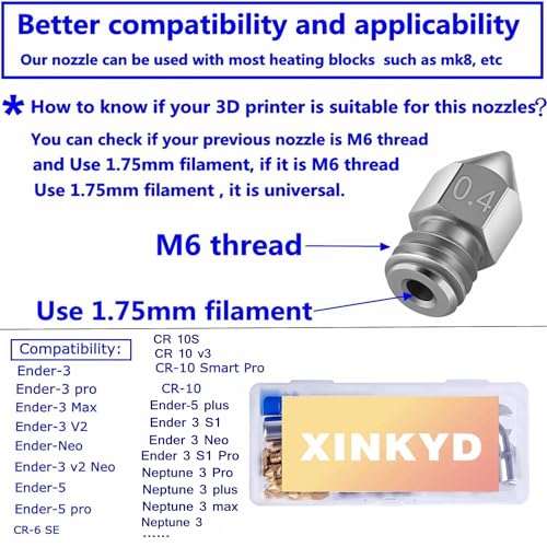 Features | Anwendbarkeit und Kompatibilität: 3D Drucker düse passend für 3D Drucker Makerbot Creality CR 10 v3 /CR6 SE/CR 10S/CR10, für MK8 Makerbot Reprap, für Neptune 3 , Neptune 3 Pro,Neptune 3 Plus, Neptune 3 Max,für Creality Ender 3,Ender 3 V2 , Ender 3 S1,Ender 3 S1 Pro,Ender 3 pro, ender 3 max ,Ender 5 ,Ender 5 pro ……, Spezifikation: Diese 28 Düsen sind alle MK8-Düse, es gibt 8 verschiedene Größen, Die Düsen bestehen aus zwei verschiedene Materialien. Messing-Nozzle:2*0.2mm,15*0.4mm,2*0.6mm,2*0.8mm. Edelstahl-Nozzle: 4*0.4mm, 1*0.5mm, 1*0.6mm, 1*0.8mm.jede Größennummer ist auf der Düse eingraviert. Der Einlassdurchmesser jeder Düse beträgt 1.75 mm und die Gewindespezifikation ist M6-Gewinde, Hochwertige Materialien, Langlebig: Messingdüsen: Bessere Wärmeleitfähigkeit. Es wird empfohlen, bei Standardtemperatur zu drucken. Filamente wie PLA, TPU und ABS sind ideal. Edelstahldüsen: härter und verschleißfester, aber weniger wärmeleitend als Messing. Es wird empfohlen, die 15 °C bei Standardtemperatur zu erhöhen, was ideal zum Befüllen von Kohlefaser, Holz oder Holz ist Dunkles Filament, Präzisionsschmieden: Unsere Düsen sind mit High-End-Technologie geschmiedet, die Innenwand ist glatt und gratfrei, der Viskositätskoeffizient ist klein, der Draht ist glatter und lässt sich nicht leicht verstopfen. Die Kontaktfläche zwischen Düse und Extruder ist flach, was das Problem des Materialaustritts von Verbrauchsmaterialien löst und den Austritt von Druckmaterial effektiv verhindert, Genug 3D-Drucker Düsenset: Die Packung enthält 8 Düsengrößen (28 Stück), 2 Schraubenschlüssel(6mm) und 5 Düsenreinigungsnadeln. 1 x transparente AufbewahrungsboxAusreichende Größe und Zubehör für Ihren Einsatz in verschiedenen Szenarien |
