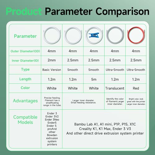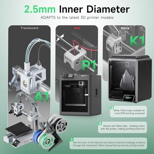 | Features | 【Für Direct Drive Extruder 3D-Drucker Entwickelt】Dieser Teflonschlauch ist hochkompatibel mit Direct Drive Extruder 3D-Druckern wie Bambu Lab A1/A1 mini/P1P/P1S/X1C und Creality K1/K1 Max/Ender 3 V3. Er sorgt für eine nahtlose Integration und optimale Leistung. Erleben Sie eine reibungslose Filamentzuführung und konsistente Druckergebnisse mit unserem zuverlässigen Produkt., 【Präzise Spezifikationen】Mit einem Innendurchmesser von 2,5 mm, einem Außendurchmesser von 4 mm für 1,75 mm Filament und einer Länge von 5 m erfüllt unser Teflonschlauch die hohen Anforderungen von 3D-Druck-Enthusiasten. Im Vergleich zum Teflonschlauch mit einem Innendurchmesser von 2 mm ermöglicht der größere Innendurchmesser von 2,5 mm ein noch reibungsloseres Durchlaufen des Filaments., 【Stabile Filamentzufuhr und Präzise Übertragung】Beim Durchlaufen des Extruders bis zum Hotend erleichtert der PTFE-Schlauch die Bewegung des Filaments mit minimaler Reibung und Widerstand. Eine stabile Filamentzufuhr und präzise Übertragung sind somit gewährleistet., 【Hitzebeständigkeit】Der Teflonschlauch ist hitzebeständig und sorgt selbst in anspruchsvollen Umgebungen für eine zuverlässige Filamentzufuhr und konsistente Druckergebnisse., 【Langlebig und Korrosionsbeständig】Hergestellt aus hochwertigen Materialien bietet unser Teflonschlauch eine außergewöhnliche Haltbarkeit und Korrosionsbeständigkeit, was für eine langanhaltende Leistung und Sicherheit bei Ihren 3D-Druckprojekten sorgt. |