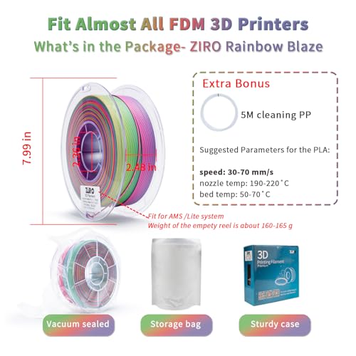| Features | 【Fast Color Change Matte PLA】ZIRO "Rainbow Blaze" kombiniert mehrere Farben in einem matten Pla Filament. Höhere Produktionstechnologie, um das wirklich schnellere Farbwechselziel zu erreichen. Die matte Oberfläche bietet einen No-Shine-Look und verleiht Ihren 3D-Arbeiten einen einzigartigen Stil., 【Hochwertiges PLA】ZIRO PLA Filament besteht aus hochwertigem Rohstoff mit ausgezeichneter Bedruckbarkeit: gute Duktilität, höhere Festigkeit, kein Geruch, keine Kettung, verstopfungsfrei und blasenfrei. Vollständig trocknend für 24h vor Vakuumversiegelung. Ermöglicht 3D-Druck-Enthusiasten, beeindruckende Arbeiten viel einfacher zu erstellen., 【1.75MM Filament Accuracy 】Erweiterte CCD-Durchmessermesssteuerung, die Maßgenauigkeit des PLA beträgt +/- 0.03mm. Die strenge Toleranz garantiert, dass ZIRO Filamentdruck einfacher und stabiler ist. Vorgeschlagene Einstellungen, Düse: 190-220˚C, Bett: 50-70˚C, Drehzahl: 30-70 mm/s. ≥0.4MM Stahl gehärtete Düse wird für matte 1,75mm PLA empfohlen., 【Passt für die meisten FDM 3D Drucker】ZIRO 3D Druckfilament funktioniert perfekt mit den meisten Druckern auf dem Markt. Eine transparente Kunststoffrolle mit größerem Innendurchmesser sorgt für eine reibungslose Zuführung. Spulendurchmesser: 20.3cm, Spulenbreite: 6.3cm, Nabenlochdurchmesser: 6cm., 【Was Sie bekommen werden】1kg/2.2lbs mattes Gradienten filament pla, ein kostenloser Wiederverschließbeutel und ein 5M Reinigungsfilament. Wenn Sie nach erstaunlichem Farbdesign PLA suchen, ist der ZIRO Tropical Ihre erste Wahl. |