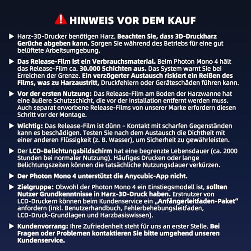 | Features | Genauigkeitsverbesserung: Photon Mono 4 verfügt über einen 7-Zoll-LCD-Bildschirm mit einer Auflösung von bis zu 10K, was 105 % präziser ist als bei Photon Mono 2. Die Pixelgenauigkeit der XY-Achse beträgt 17 x 17 µm, Lichtquellensystem: Das gleiche LighTurbo system wie bei der M5-Flaggschiffserie wird verwendet, um Schichtlinien zu reduzieren und die Oberfläche des Modells glatt zu machen. Die kürzeste Belichtungszeit für eine einzelne Schicht kann nur 1,5 Sekunden betragen, Größenupgrade: Photon Mono 4 verfügt über eine Druckfläche von 153,4 mm x 87 mm x 165 mm und ein maximales Druckvolumen von 2,2 l, Druckplattform 2.0: Eine neue Generation von Bauplatten für das Lasergravurverfahren, die Texturstil und -tiefe optimiert, die Modellhaftung verstärkt, die Wahrscheinlichkeit des Abfallens und Verziehens des Modells verringert und die Druckerfolgsrate verbessert, Stromausfallschutz: Bei einem unerwarteten Stromausfall des Geräts kann der Druckvorgang nach Wiederherstellung der Stromversorgung an der Unterbrechungsstelle fortgesetzt werden. So wird die durch den unerwarteten Stromausfall verursachte Material- und Zeitverschwendung vermieden |