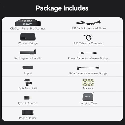 | Features | Verbindung über Telefon oder PC : Creality Ferret Pro unterstützt zwei Möglichkeiten, einen Scanner anzuschließen, um einen Scanvorgang auszuführen: (1) Das Mobiltelefon stellt über ein WLAN-Modul eine Verbindung zum Scanner her und Scans werden über das Mobiltelefon verarbeitet. (2) Der PC stellt eine direkte Verbindung her Verbinden Sie den Scanner per Datenkabel mit dem Scanner, um die Scanarbeiten am PC abzuschließen., Systemanforderungen : (1) Android 10.0 oder höher (RAM>8G, Android 10 unterstützt nur Konnektivität über Wi-Fi, Wi-Fi 6 oder höher). (2)iPhone 11 oder höher (RAM>4G, unterstützt nur Konnektivität über WLAN, iOS: OS 15 oder höher). (3)PC: i5-Gen8-CPU oder besser, Windows10/11 (64-Bit), RAM>=8G. (4)Mac: M1/M2-Serie-CPU, macOS: 11.7.7 oder höher (Big Sur/Monterey/). Ventura), RAM>=8G. (5)Mac: Intel-CPU (i5-Gen8 oder besser), macOS: 10.15.7 oder höher (Catalina/Big Sur/Monterey/Ventura), RAM>=8G., Hohe Qualität und schnelles Scannen : Das Objektiv des Creality Ferret Pro 3D-Scanners hat eine Genauigkeit von bis zu 0,1 mm, sorgt für eine bessere Maßgenauigkeit und erfasst mehr Details. Der eingebaute spezifische 3D-Bildgebungs-ASlC-Chip bietet Rechenleistung und ermöglicht schnelles Scannen für mittlere und große Objekte. Ausgestattet mit WiFi6 Wireless Bridge, dreimal schneller als WiFi5, sorgt es für eine reibungslosere Datenerfassung bei der Nutzung eines Mobiltelefons., Anti-Shake, reibungsloses und effizientes Scannen : Ferret Pro-Scanner Ausgestattet mit One-Shot-3D-Bildgebungstechnologie sorgt die schnelle Backtracking-Geschwindigkeit für reibungsloseres Handscannen mit einer Geschwindigkeit von bis zu 20 fps. Gleichzeitig verfügt das Objektiv über eine Autofokus-Funktion, um sicherzustellen, dass Sie beim Scannen keine schlechten Scan-Erfahrungen wie Bildverluste oder Unschärfen erleben., 24-Bit-Vollfarb-Scanning: Der Ferret Pro-Scanner ist mit einer Millionen-Pixel-Vollfarb-RGB-Kamera und einem exklusiven Farbzuordnungsalgorithmus ausgestattet, der eine außergewöhnliche Erfassung von Modelldetails und Farben gewährleistet, selbst in Umgebungen mit wenig Licht Ermöglicht realistischste Textureffekte. Zwei zusätzliche LEDs helfen dabei, Details präzise zu erfassen und die Farbe und Textur von Objekten originalgetreu wiederzugeben., Schwarze/metallische Objekte ohne Sprühen scannen : Auch ohne Scanspray können Sie Autos, Autoteile, Reifen und andere schwarze/metallische Objekte scannen, um den gewünschten Modelleffekt zu erzielen. Entwickelt mit der fortschrittlichen DOE-3D-Strukturlichttechnologie, CR-Scan Ferret Pro verfügt über eine höhere Anpassungsfähigkeit an die Umwelt und behält auch bei Sonnenlicht (<30000 Lux) eine hervorragende Leistung bei. |
